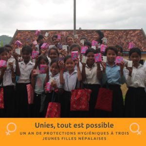 Grâce aux trousses de serviettes hygiéniques lavables, sûres et durables, les jeunes filles du Népal rural peuvent aller à l’école tous les jours, sans manquer les cours. Grâce à ce don, les règles ne seront plus un obstacle pour trois jeunes filles.